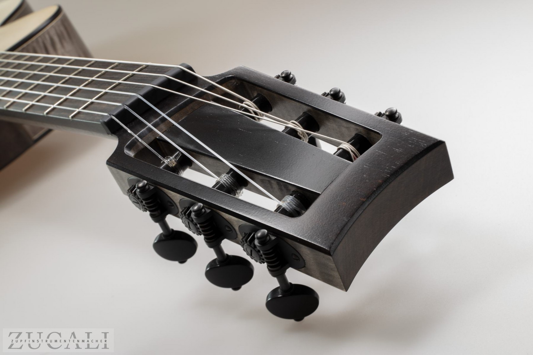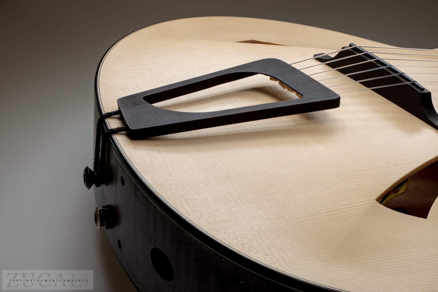 Secondly, the pickup. Udo Rösner, always looking for improvements, has developed a pickup that works with a symmetrical piezo sensor. This makes it possible to work without a preamp in the guitar. This means that the symmetrical signal is sent via a stereo jack cable into a foot pedal (preamp, DI box etc.). In this box, the two signals are inverted again, which cancels out all the noise that the cable always catches (like an antenna). The result is an interference-free signal, which in addition not only clean, but also sounds wonderful.